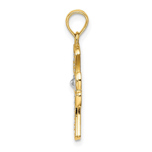 14K W/ Rhodium D/C Flower Design Cross Charm