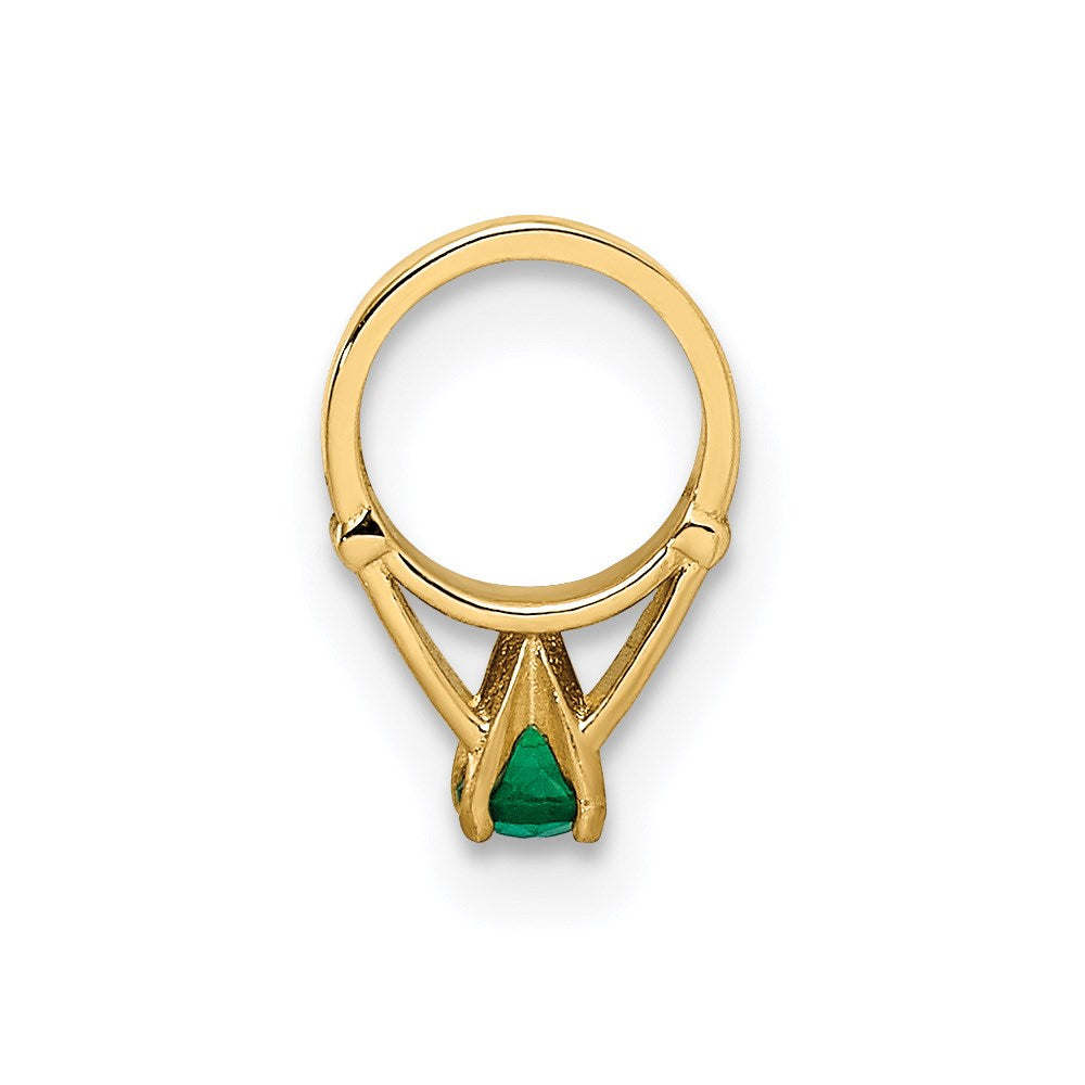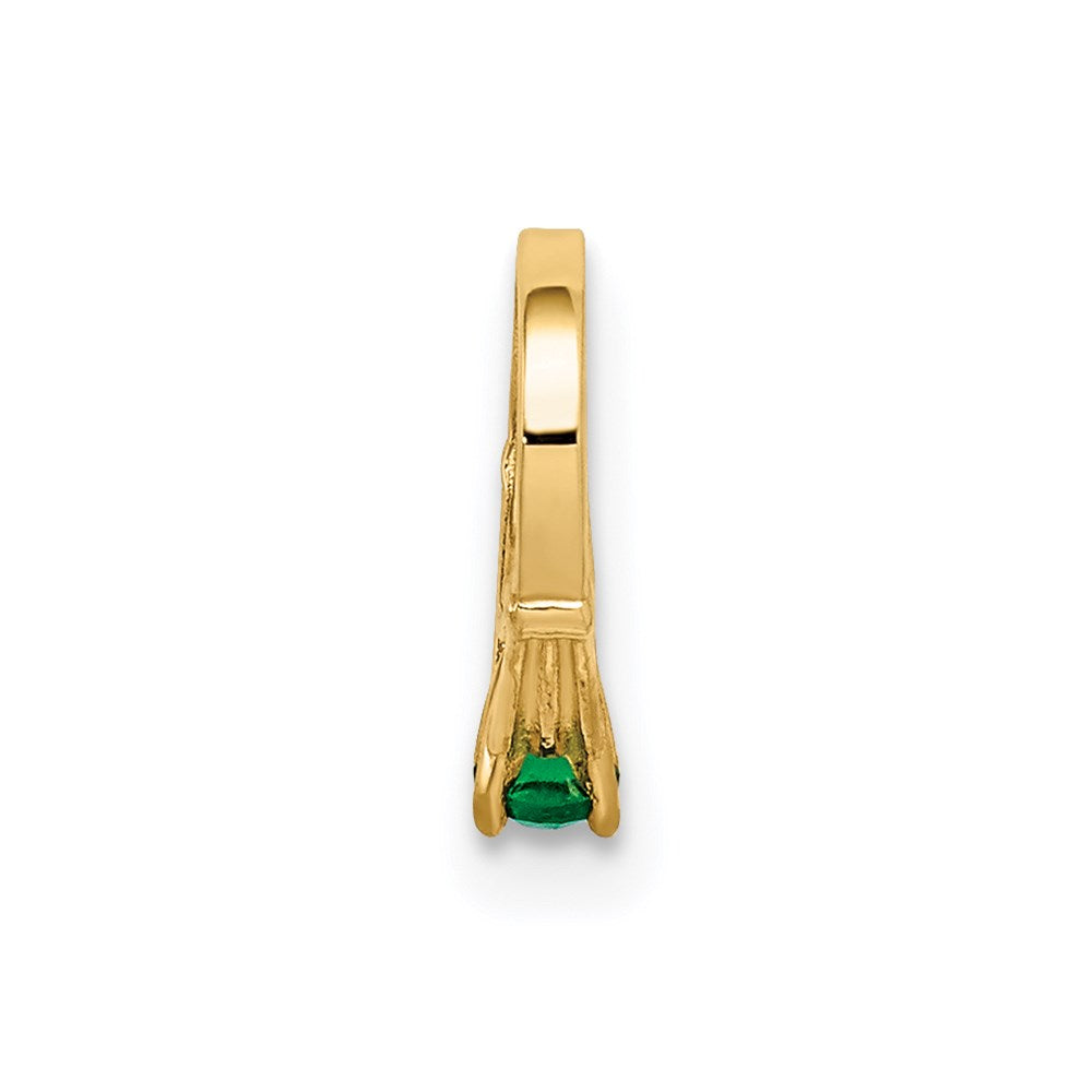 Material: Primary - Purity:14K|Finish:Polished|Stone Color_1:Green|Stone Quantity_1:1|Charm/Element Length:9.5 mm|Feature:Solid|Manufacturing Process:Casted|Material: Primary:Gold|Stone Shape_1:Round|Stone Treatment_1:Synthetic|Width of Item:6.6 mm|Product Type:Jewelry|Jewelry Type:Pendants & Charms|Sold By Unit:Each|Pendant/Charm Type:Birthstone|Material: Primary - Color:Yellow|Feature 2:3D|Stone Creation Method_1:Synthetic|Stone Type (Other)_1:Glass|Birthstone Month:(05) May|Birthstone Month_1:(05) May