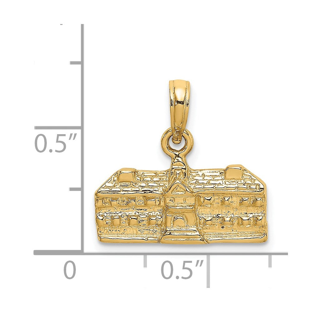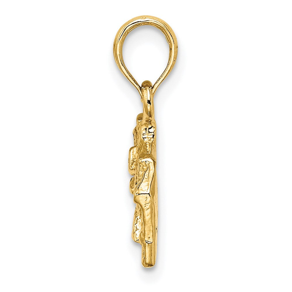 Material: Primary - Purity:14K|Finish:Polished|Length of Item:15 mm|Charm/Element Length:8.3 mm|Charm/Element Thickness:2.2 mm|Charm/Element Width:18.1 mm|Feature:3D|Manufacturing Process:Casted|Material: Primary:Gold|Width of Item:18.1 mm|Product Type:Jewelry|Jewelry Type:Pendants & Charms|Sold By Unit:Each|Pendant/Charm Type:Themed|Texture:Textured|Bail Width:5 mm|Material: Primary - Color:Yellow|Bail Length:7 mm