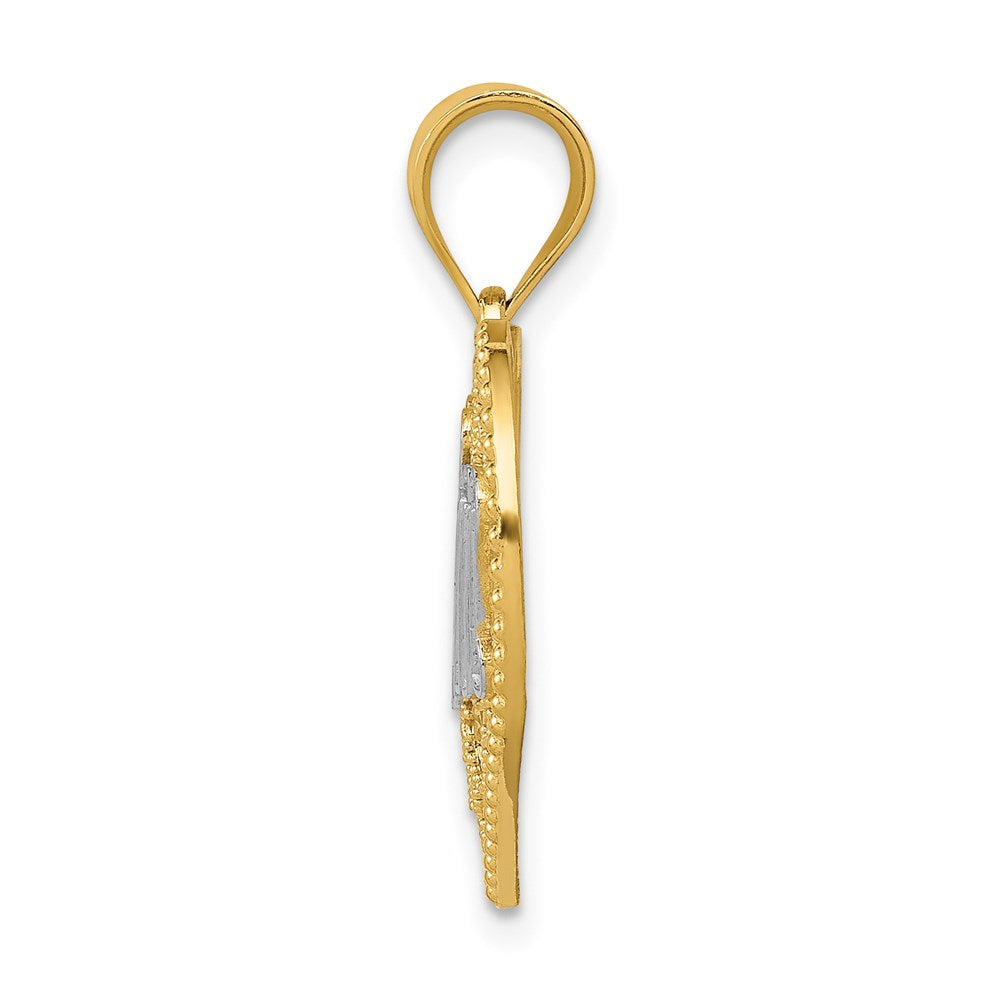 Material: Primary - Purity:14K|Finish:Polished|Length of Item:21 mm|Material: Accents:Rhodium|Material: Accent Color 1:White|Charm/Element Length:18 mm|Charm/Element Width:25 mm|Feature:Solid|Manufacturing Process:Casted|Material: Primary:Gold|Width of Item:25 mm|Product Type:Jewelry|Jewelry Type:Pendants & Charms|Sold By Unit:Each|Pendant/Charm Type:Themed|Texture:Textured|Material: Primary - Color:Yellow|Bail Length:5 mm|Feature 2:Filigree