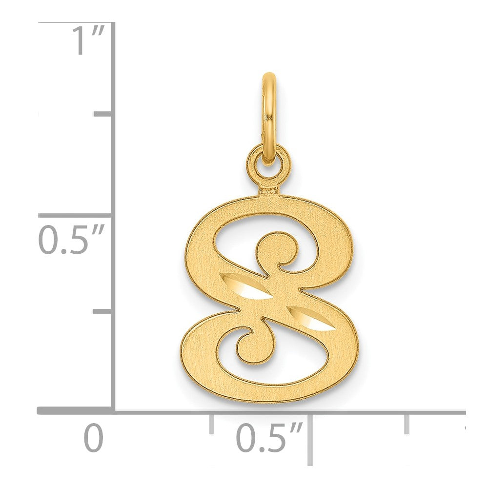 Material: Primary - Purity:14K|Finish:Brushed|Length of Item:20.4 mm|Charm/Element Length:16.4 mm|Charm/Element Thickness:1 mm|Charm/Element Width:11.2 mm|Feature:Personalized|Material: Primary:Gold|Thickness:.89 mm|Width of Item:11.2 mm|Engravable:Not Recommended|Product Type:Jewelry|Jewelry Type:Pendants & Charms|Sold By Unit:Each|Pendant/Charm Type:Themed|Gender:Unisex|Texture:Diamond-cut|Profile Type:Flat Back|Bail Width:0.9 mm|Material: Primary - Color:Yellow|Bail Length:5.8 mm|Feature 2:Solid|Relative Size:Large|Feature 3:Satin Back|Letter:S|Bail (Inside) Length:2.5|Bail (Inside) Width:2.5|Bail (Inside) Width U/M:mm|Bail (Inside) Length U/M:mm