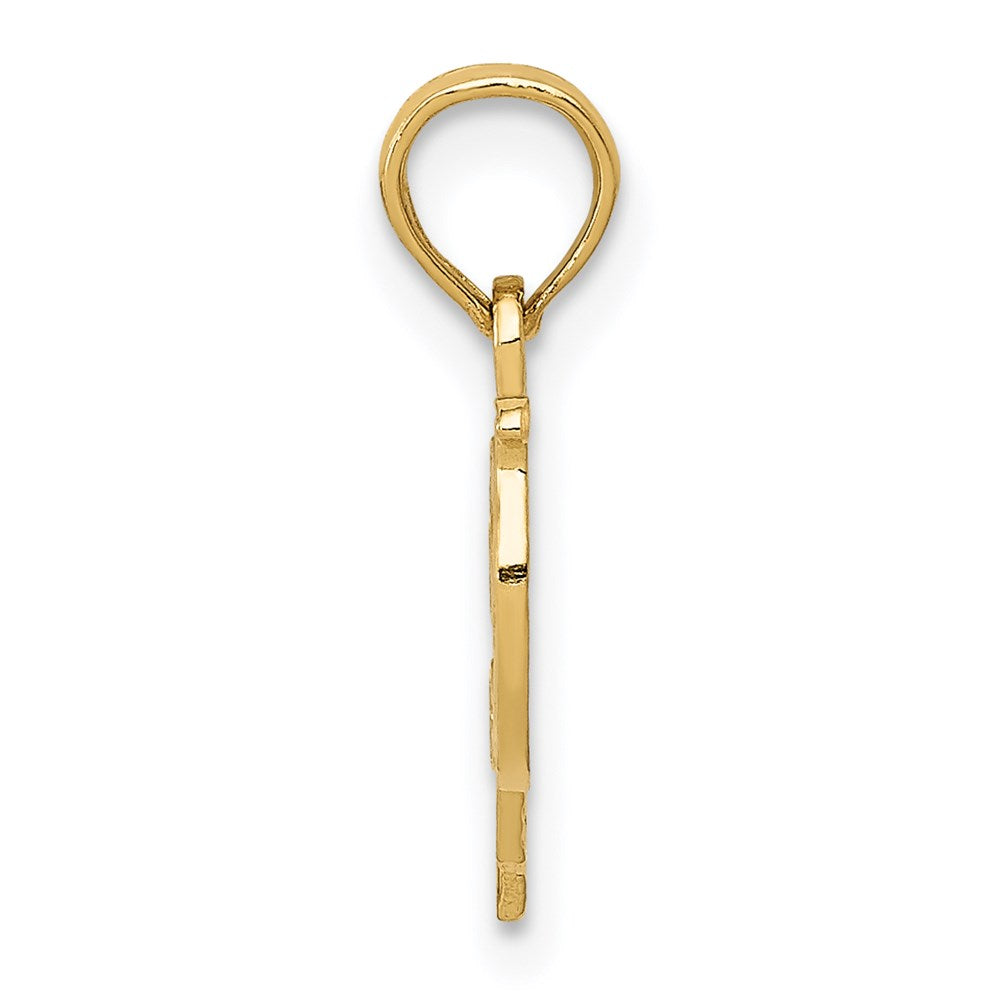 Material: Primary - Purity:14K|Length of Item:33.25 mm|Charm/Element Length:29.25 mm|Charm/Element Width:15.3 mm|Feature:Solid|Manufacturing Process:Casted|Material: Primary:Gold|Width of Item:15.3 mm|Product Type:Jewelry|Jewelry Type:Pendants & Charms|Sold By Unit:Each|Pendant/Charm Type:Themed|Profile Type:Textured Back|Bail Width:4.5 mm|Material: Primary - Color:Yellow|Bail Length:5 mm
