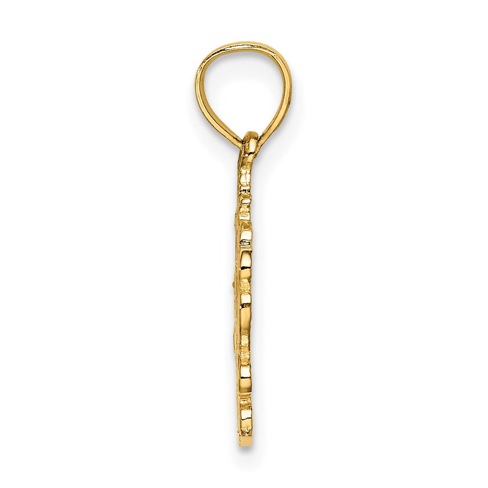 Material: Primary - Purity:14K|Finish:Polished|Length of Item:32.25 mm|Charm/Element Length:28.25 mm|Charm/Element Width:18.8 mm|Feature:Solid|Manufacturing Process:Casted|Material: Primary:Gold|Width of Item:18.8 mm|Product Type:Jewelry|Jewelry Type:Pendants & Charms|Sold By Unit:Each|Pendant/Charm Type:Themed|Texture:Textured|Bail Width:4.5 mm|Material: Primary - Color:Yellow|Bail Length:5 mm