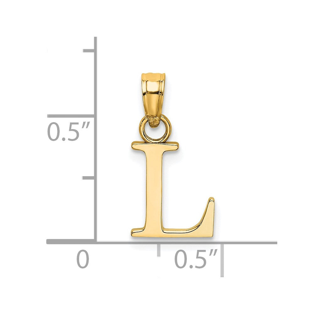Material: Primary - Purity:14K|Finish:Polished|Length of Item:15.5 mm|Charm/Element Length:15.50 mm|Charm/Element Thickness:.85 mm|Charm/Element Width:7.69 mm|Manufacturing Process:Casted|Material: Primary:Gold|Width of Item:7.69 mm|Product Type:Jewelry|Jewelry Type:Pendants & Charms|Sold By Unit:Each|Material: Primary - Color:Yellow|Relative Size:Small|Letter:L|Bail (Inside) Length:3|Bail (Inside) Width:3.25|Bail (Inside) Width U/M:mm|Bail (Inside) Length U/M:mm