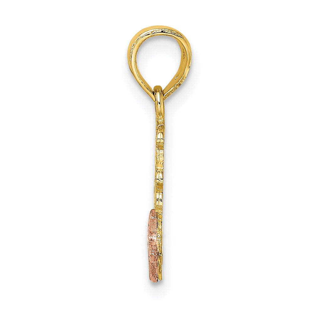 Material: Primary - Purity:14K|Length of Item:18.1 mm|Charm/Element Length:13.1 mm|Manufacturing Process:Casted|Material: Primary:Gold|Width of Item:12 mm|Product Type:Jewelry|Jewelry Type:Pendants & Charms|Sold By Unit:Each|Pendant/Charm Type:Themed|Texture:Textured|Profile Type:Flat Back|Bail Width:4.5 mm|Material: Primary - Color:Two-Tone|Bail Length:5 mm