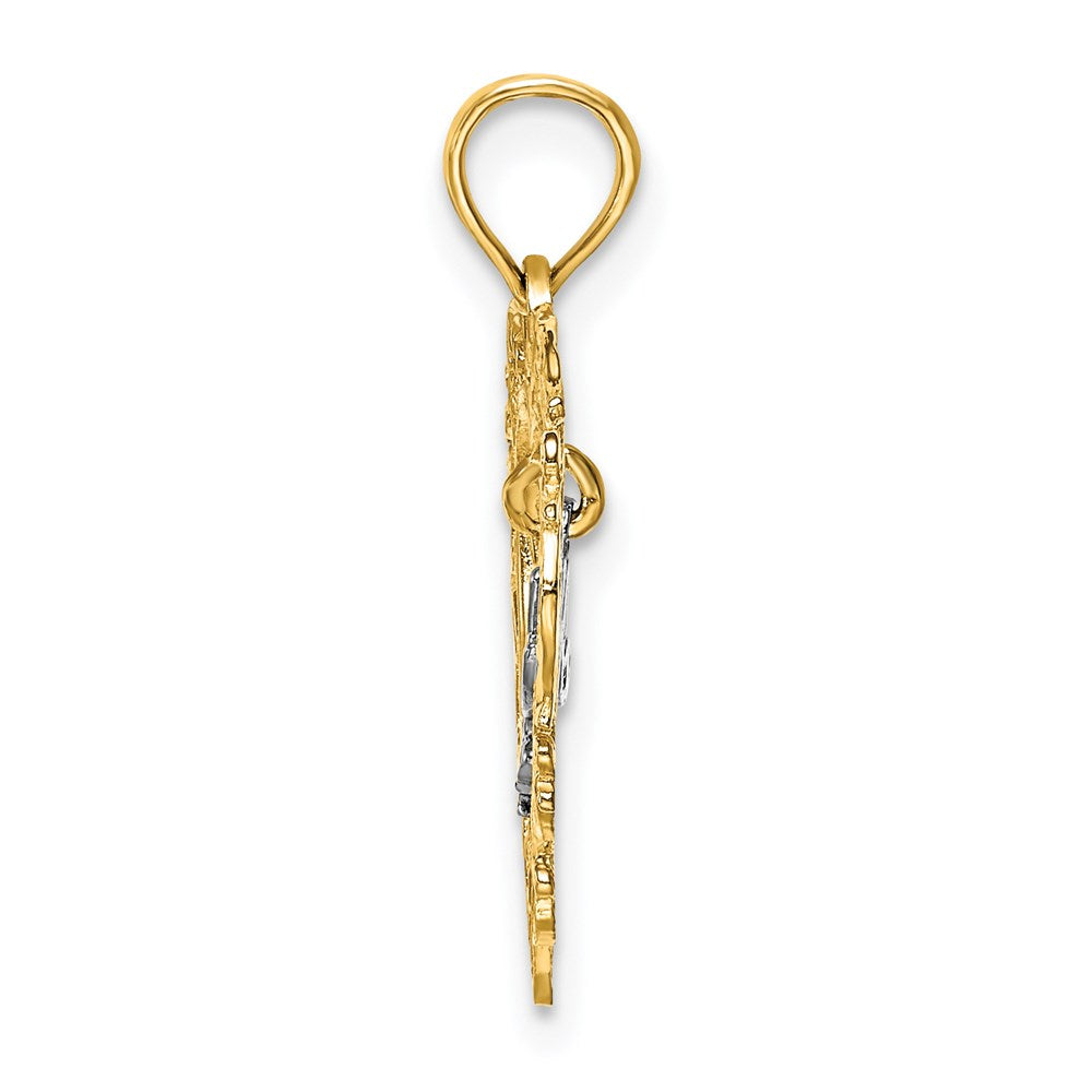 Material: Primary - Purity:14K|Finish:Polished|Length of Item:21.6 mm|Charm/Element Length:17.6 mm|Charm/Element Width:18.2 mm|Manufacturing Process:Casted|Material: Primary:Gold|Width of Item:18.2 mm|Product Type:Jewelry|Jewelry Type:Pendants & Charms|Sold By Unit:Each|Pendant/Charm Type:Themed|Bail Width:4.5 mm|Material: Primary - Color:Two-Tone|Bail Length:5 mm