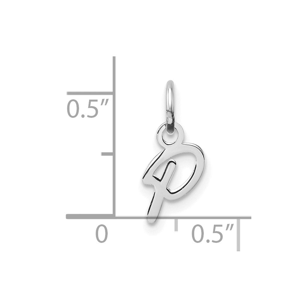 Material: Primary - Purity:14K|Finish:Polished|Length of Item:14 mm|Plating:Rhodium|Charm/Element Length:10.8 mm|Charm/Element Thickness:0.4 mm|Charm/Element Width:5.75 mm|Feature:Personalized|Material: Primary:Gold|Engravable:Not Recommended|Product Type:Jewelry|Jewelry Type:Pendants & Charms|Sold By Unit:Each|Pendant/Charm Type:Themed|Gender:Unisex|Profile Type:Flat Back|Bail Width:0.9 mm|Material: Primary - Color:White|Bail Length:5.8 mm|Feature 2:Satin Back|Plating Color:Silver Tone|Relative Size:Large|Letter:P|Bail (Inside) Length:2.4|Bail (Inside) Width:2.4|Bail (Inside) Width U/M:mm|Bail (Inside) Length U/M:mm