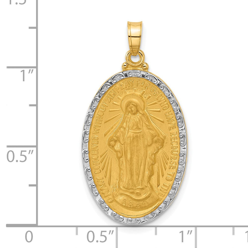 14K with Rhodium Satin and Polished Miraculous Medal Solid Oval Pendant