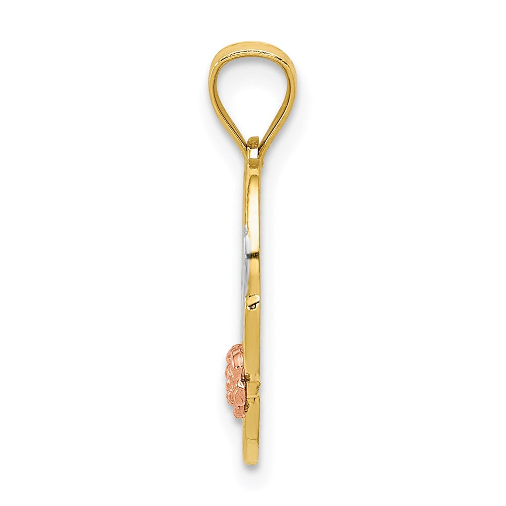 Material: Primary - Purity:14K|Finish:Polished|Length of Item:15.2 mm|Material: Accents:Rhodium|Material: Accent Color 1:Silver Tone|Charm/Element Length:15.45 mm|Charm/Element Thickness:0.82 mm|Charm/Element Width:16.6 mm|Feature:Solid|Manufacturing Process:Casted|Material: Primary:Gold|Width of Item:16.6 mm|Product Type:Jewelry|Jewelry Type:Pendants & Charms|Sold By Unit:Each|Pendant/Charm Type:Themed|Texture:Diamond-cut|Profile Type:Textured Back|Bail Width:2.8 mm|Material: Primary - Color:Two-Tone|Bail Length:5.9 mm