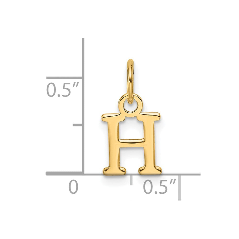 Material: Primary - Purity:14K|Finish:Polished|Length of Item:15.2 mm|Charm/Element Length:10.7 mm|Charm/Element Thickness:0.7 mm|Charm/Element Width:7.7 mm|Feature:Personalized|Material: Primary:Gold|Engravable:Not Recommended|Product Type:Jewelry|Jewelry Type:Pendants & Charms|Sold By Unit:Each|Pendant/Charm Type:Themed|Gender:Unisex|Profile Type:Flat Back|Bail Width:0.9 mm|Material: Primary - Color:Yellow|Bail Length:5.8 mm|Relative Size:Medium|Letter:H|Bail (Inside) Length:2.2|Bail (Inside) Width:2.2|Bail (Inside) Width U/M:mm|Bail (Inside) Length U/M:mm