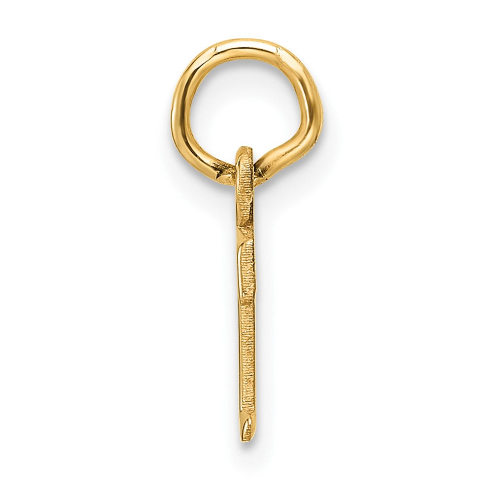 Material: Primary - Purity:14K|Finish:Polished|Length of Item:15 mm|Charm/Element Length:11.1 mm|Charm/Element Thickness:0.7 mm|Charm/Element Width:8 mm|Feature:Personalized|Material: Primary:Gold|Engravable:Not Recommended|Product Type:Jewelry|Jewelry Type:Pendants & Charms|Sold By Unit:Each|Pendant/Charm Type:Themed|Gender:Unisex|Profile Type:Flat Back|Bail Width:0.9 mm|Material: Primary - Color:Yellow|Bail Length:5.8 mm|Relative Size:Medium|Letter:T|Bail (Inside) Length:2.2|Bail (Inside) Width:2.2|Bail (Inside) Width U/M:mm|Bail (Inside) Length U/M:mm