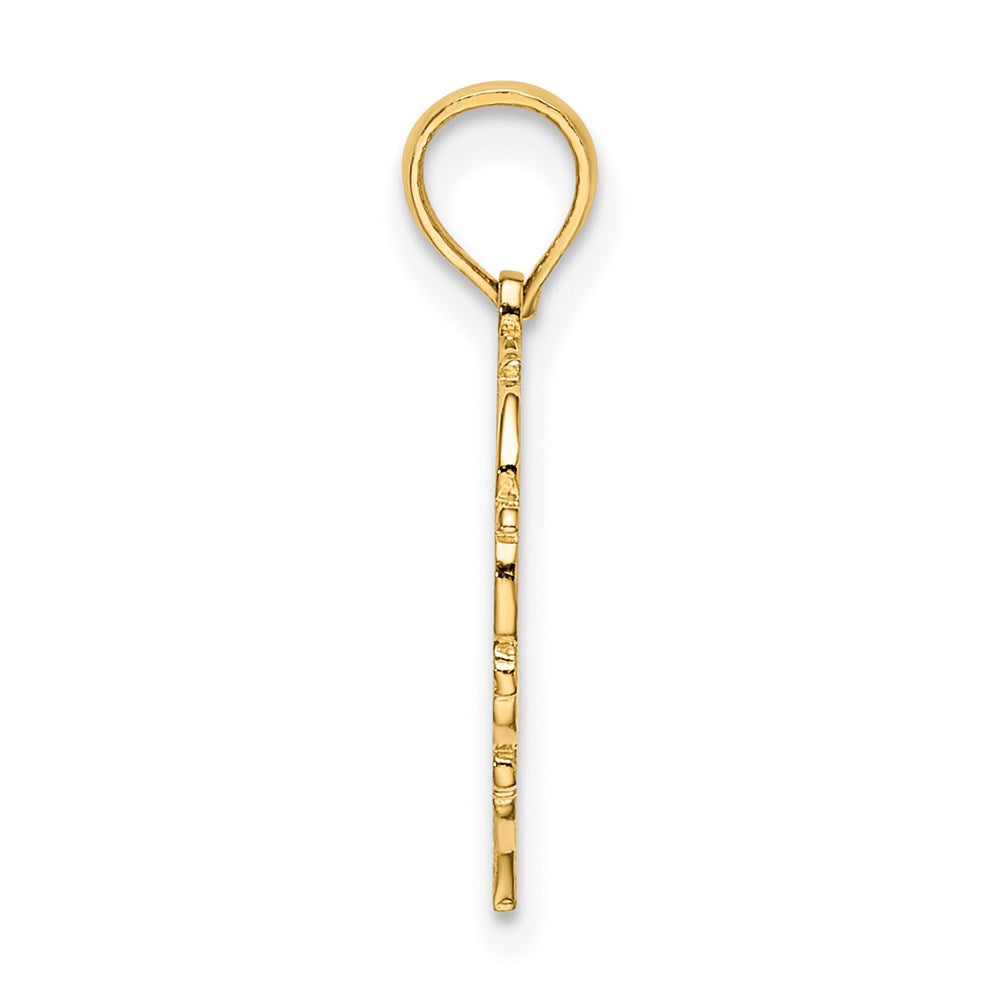 Material: Primary - Purity:14K|Finish:Polished|Length of Item:17.3 mm|Charm/Element Length:14.3 mm|Charm/Element Thickness:0.6 mm|Charm/Element Width:12.57 mm|Feature:Solid|Manufacturing Process:Casted|Material: Primary:Gold|Width of Item:12.57 mm|Product Type:Jewelry|Jewelry Type:Pendants & Charms|Sold By Unit:Each|Pendant/Charm Type:Personalized|Texture:Textured|Bail Width:4.5 mm|Material: Primary - Color:Yellow|Bail Length:5 mm|Relative Size:Small|Letter:W