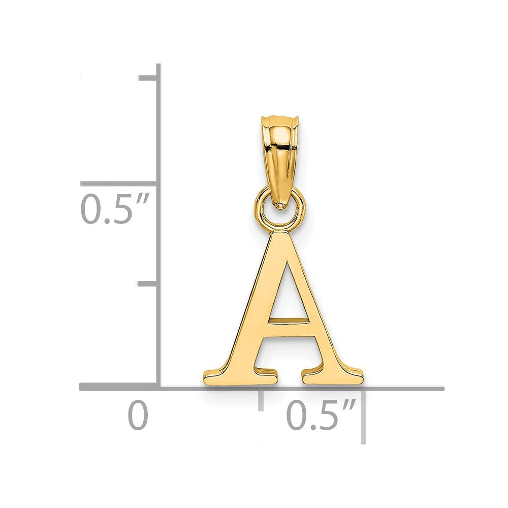 Material: Primary - Purity:14K|Finish:Polished|Length of Item:15.85 mm|Charm/Element Length:12.85 mm|Charm/Element Thickness:1.1 mm|Charm/Element Width:10.35 mm|Manufacturing Process:Casted|Material: Primary:Gold|Width of Item:10.35 mm|Product Type:Jewelry|Jewelry Type:Pendants & Charms|Sold By Unit:Each|Pendant/Charm Type:Personalized|Bail Width:4.5 mm|Material: Primary - Color:Yellow|Bail Length:5 mm|Relative Size:Small|Letter:A|Bail (Inside) Length:3|Bail (Inside) Width:3.25|Bail (Inside) Width U/M:mm|Bail (Inside) Length U/M:mm