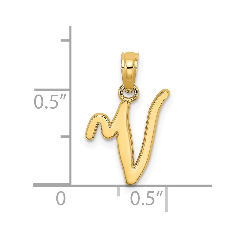 Material: Primary - Purity:14K|Finish:Polished|Length of Item:17.15 mm|Charm/Element Length:14.15 mm|Charm/Element Thickness:1.05 mm|Charm/Element Width:11.3 mm|Manufacturing Process:Casted|Material: Primary:Gold|Width of Item:11.3 mm|Product Type:Jewelry|Jewelry Type:Pendants & Charms|Sold By Unit:Each|Bail Width:4.5 mm|Material: Primary - Color:Yellow|Bail Length:5 mm|Relative Size:Small|Letter:V
